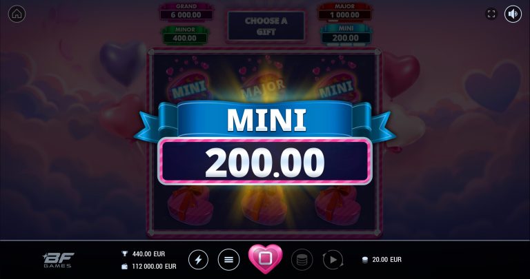 Adding even more sweetness, the Valentine’s Rewards “Pick & Click” feature can be triggered on any base game spin. Nine beautifully wrapped Valentine’s gifts appear, each hiding a Mini, Minor, Major, or Grand reward. Pick gifts one by one and match three identical rewards to claim your prize — from charming Mini wins to the unforgettable Grand Reward worth up to 300× your bet.