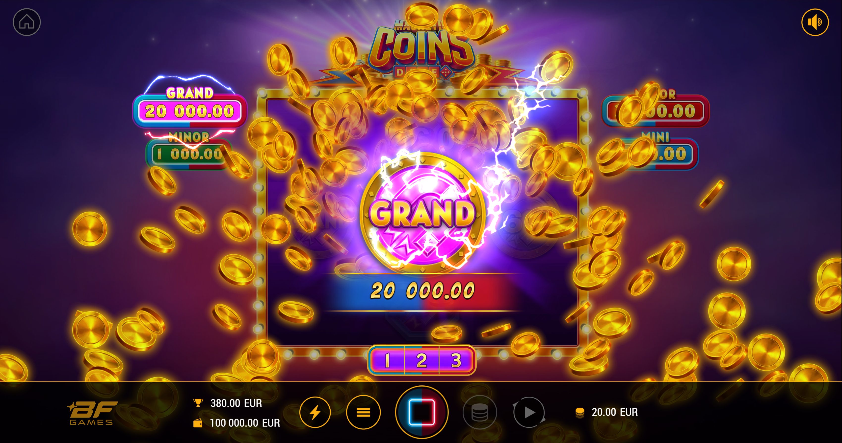 The Magnet appears only on the second reel and is the heart of the action. It collects all Coin and Reward symbols from reels one and three, adding their value directly to your winnings. Coin symbols award multipliers from 1× to 15× your bet, while Reward symbols bring jackpot-style prizes — from Mini (20×) to the massive Grand (1000×). Even more action kicks off when three bonus symbols land, launching the Magnet Bonus. In this hold-and-win style feature, only bonus symbols appear, and any Magnets that land stay sticky while collecting everything in sight over a series of respins.