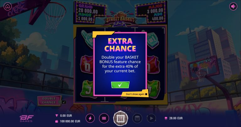 Enter the fast-paced world of Street Basket 3×3, where every reel is a court and every symbol a shot at victory. BALL and REWARD symbols appear on the first and third reels, while BASKET on the middle reel collects them to boost your winnings. Hit BONUS symbols on all 3 reels to trigger BASKET BONUS, featuring respins where each new symbol resets the counter. Activate EXTRA CHANCE to double your bonus opportunities and aim for MINI, MINOR, MAJOR, or even GRAND prizes. Every spin is your chance for a slam dunk!